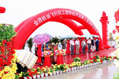 2010年8月20日上午10時,金昌機(jī)場飛行區(qū)停機(jī)坪混凝土道面工程順利封倉。甘肅省交通運輸廳、金昌市政府、甘肅機(jī)場建設(shè)投資管理公司、甘肅機(jī)場項目建設(shè)指揮部及施工單位等有關(guān)單位領(lǐng)導(dǎo)現(xiàn)場見證了道面工程順利封倉的時刻。