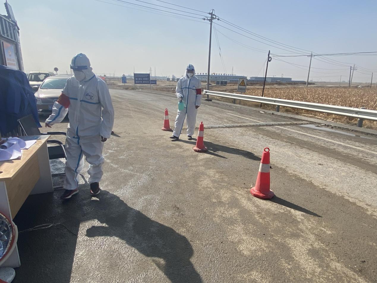 項目部黨支部書記杜騫,第一時間安排人員對北門卡口進行布置,安排采購疫情物資(醫用口罩、防護服、測溫槍、消毒液等),與10月1日10點左右在新機場北門疫情防控卡點布設完畢,配備了12名項目部管理人員(8小時三班倒)在卡口進行疫情防控。新機場北門疫情防控卡點人員對過往車輛、人員進行登記,掃碼、查看行程卡、核酸報告、登記來源地、去往地點。對無48小時核酸報告的人員進行勸返。